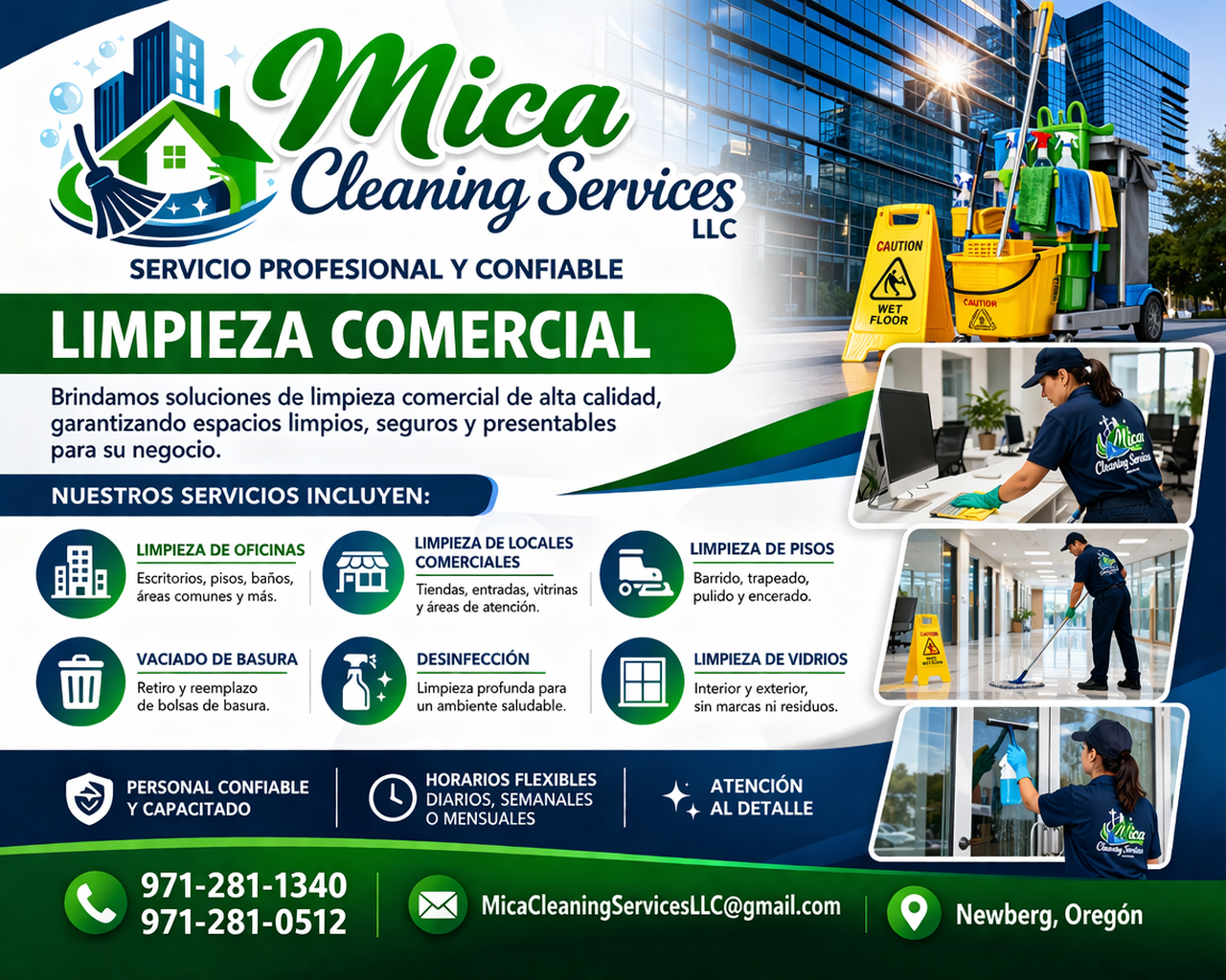 Mica Cleaning Service LLC se especializa en limpieza comercial, comprometidos con servicios de alta calidad para mantener espacios de trabajo limpios, seguros y profesionales. Brindamos soluciones personalizadas para oficinas, locales comerciales y otras instalaciones, asegurando un ambiente impecable.
